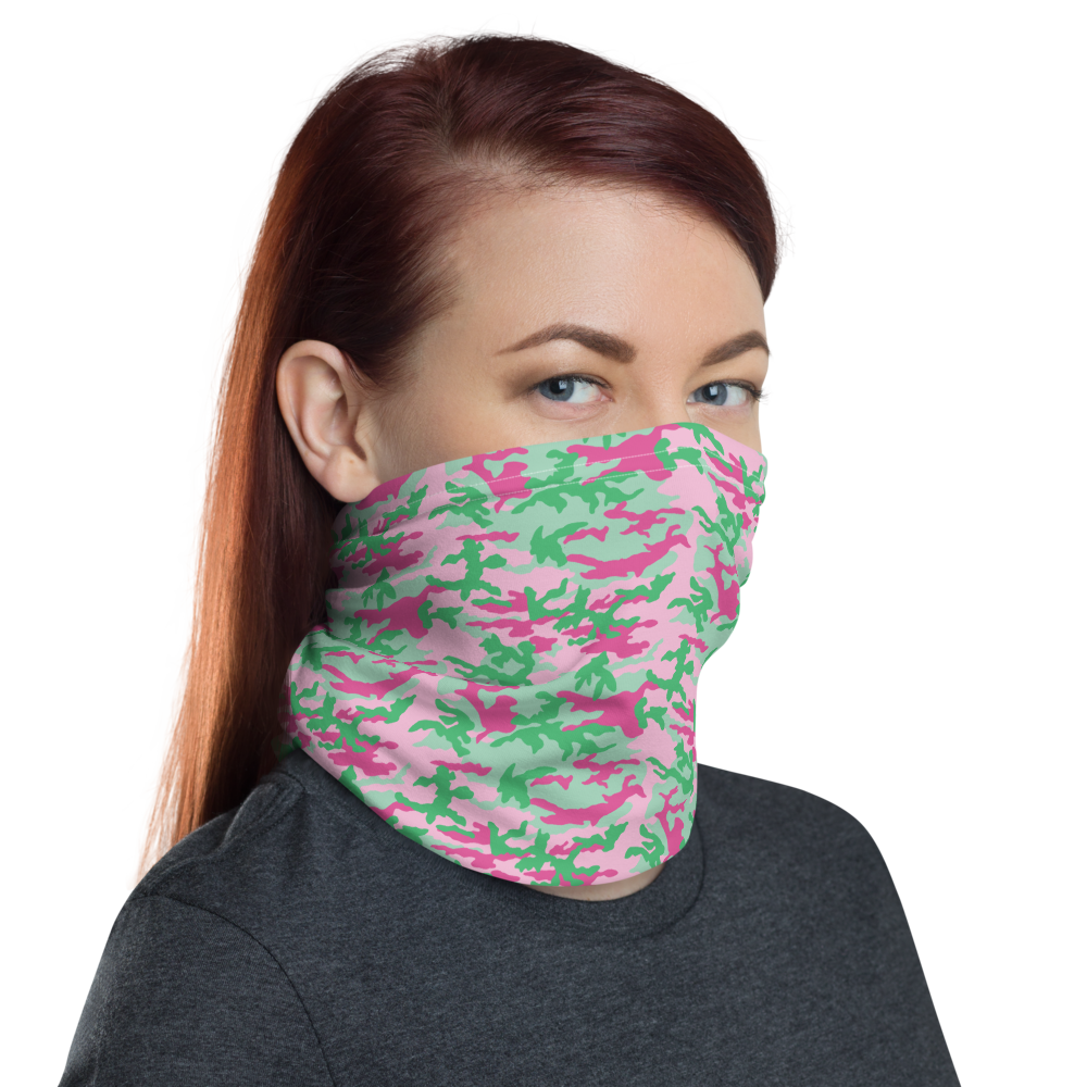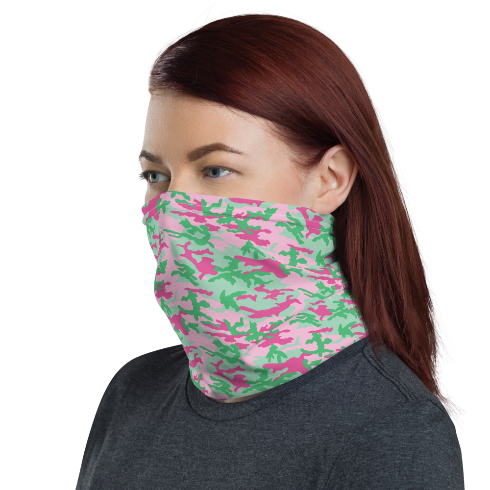 The Pink and Green Camo Neck Gaiter from Design Express is a versatile unisex accessory that can be used as a face covering, headband, bandana, wristband, and neck warmer. When used as a face covering, it can help limit respiratory droplets. Upgrade your accessory game and find a matching face shield for each of your outfits.