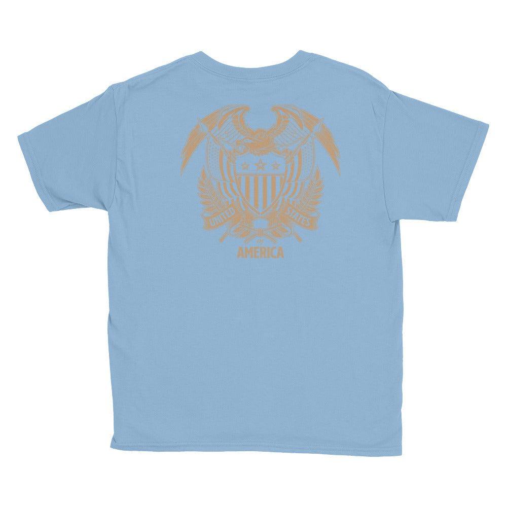 Light Blue / XS United States Of America Eagle Illustration Reverse Gold Backside Youth Short Sleeve T-Shirt by Design Express
