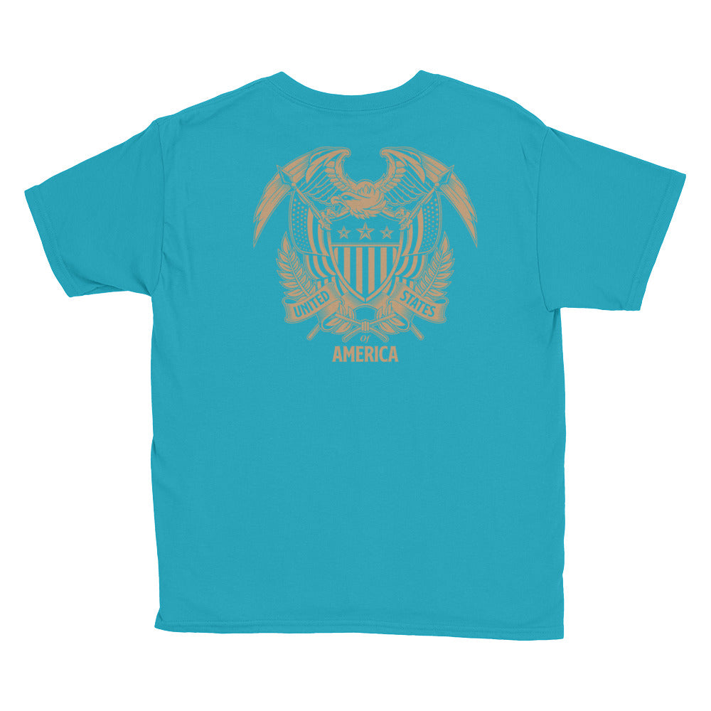 Caribbean Blue / XS United States Of America Eagle Illustration Reverse Gold Backside Youth Short Sleeve T-Shirt by Design Express